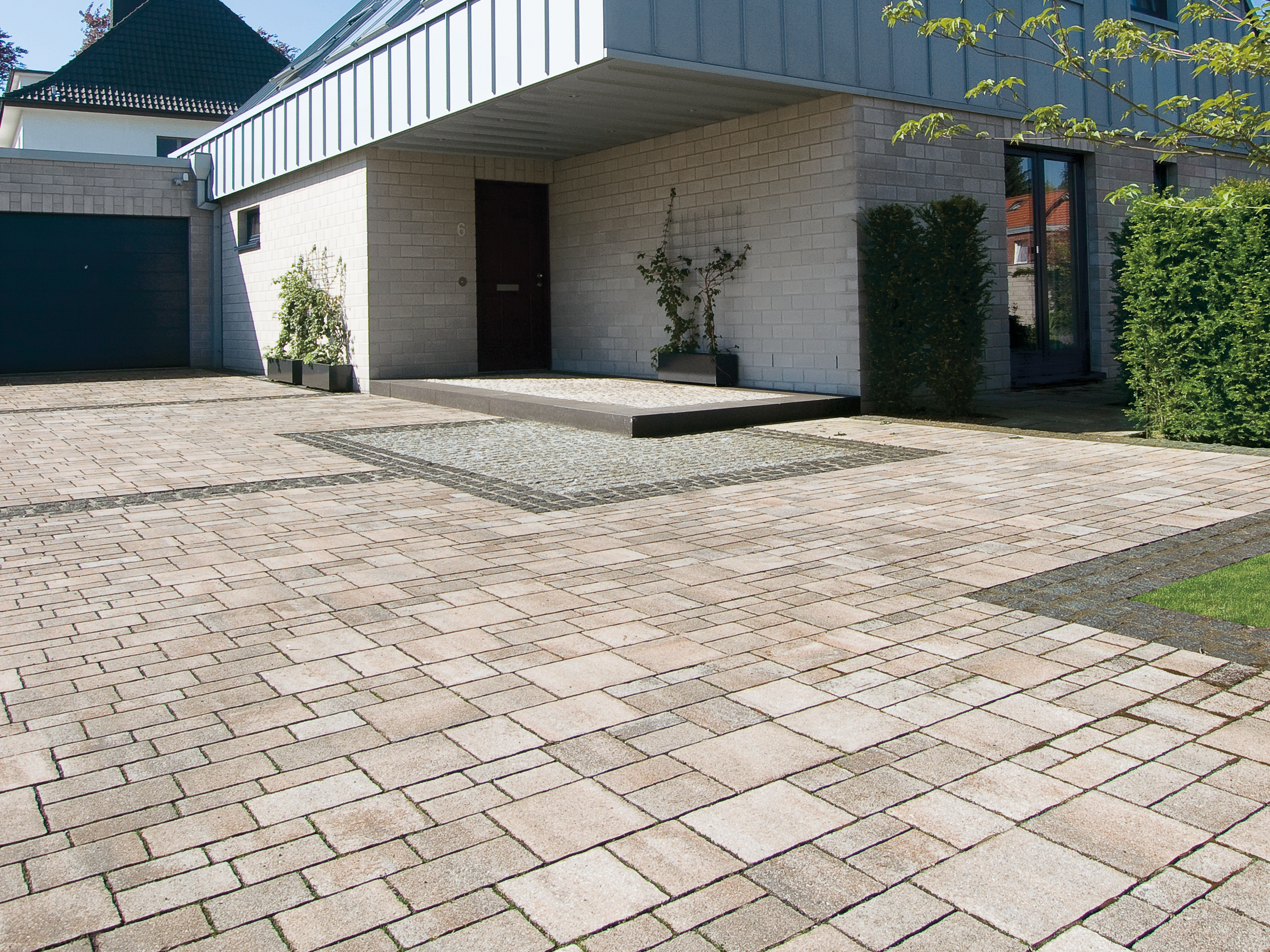 Vielfalt ist Programm: Mit 18 unterschiedlichen Groß- und Kleinformaten lädt das Mehrsteinsystem zum kreativen Gestalten ein – beliebt sind insbesondere Bahnenverlegung und wilder Verband. Dabei entwickeln die ansprechenden Steinfarben ein stimmungsvolles Bild. Eine ästhetische Lösung auch für die Regenwasserversickerung über durchlässige Fugen.