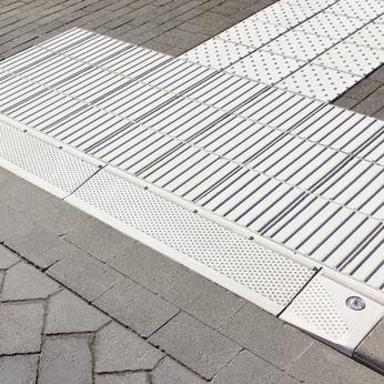 - Orientierungs- und Leitsystem mit taktil erfassbarem Noppenprofil (Aufmerksamkeitsfeld) für Fußgängerbereiche im Straßenraum sowie an Bahn- und Haltestellenanlagen